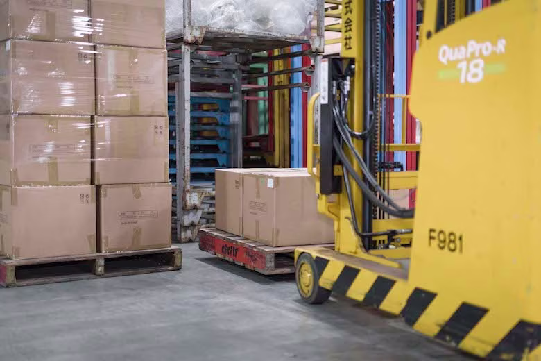 この日はネットショップで販売する中国製自転車が入ってきたところだそう。ちょうど大量の自転車が入った段ボールをフォークリフトで荷物を移動させているところでしたが、高く積まれた段ボールを少し怖くなるくらいの速さでどんどん運んでいき、あっという間に荷物が片付いていきました。